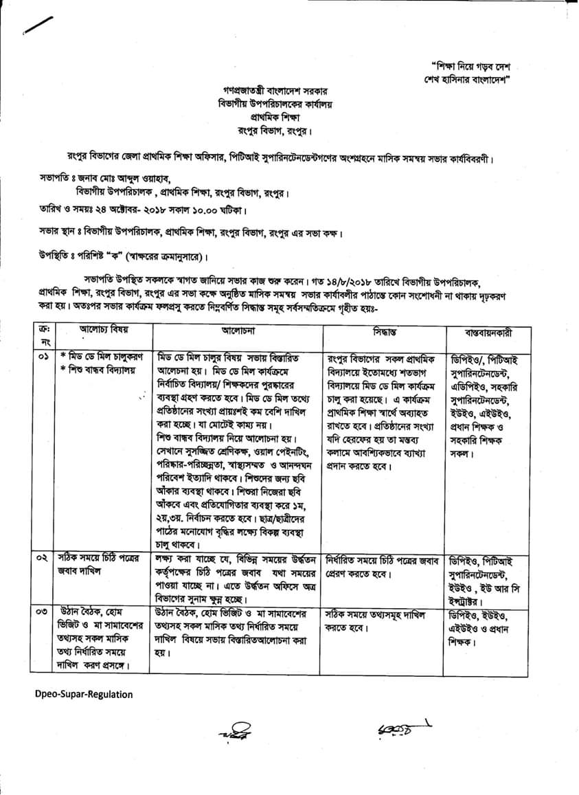 বিভাগীয় উপপরিচালক, প্রাথমিক শিক্ষা,রংপুর বিভাগ রংপুর আয়োজিত অত্র বিভাগের জেলা প্রাথমিক শিক্ষা অফিসার ও পিটিআই সুপারিন্টেনডেন্টগণ এর অংশগ্রহণে মাসিক সমন্বয় সভার কার্যবিবরণী। তারিখঃ ২৪/১০/২০১৮ ইং