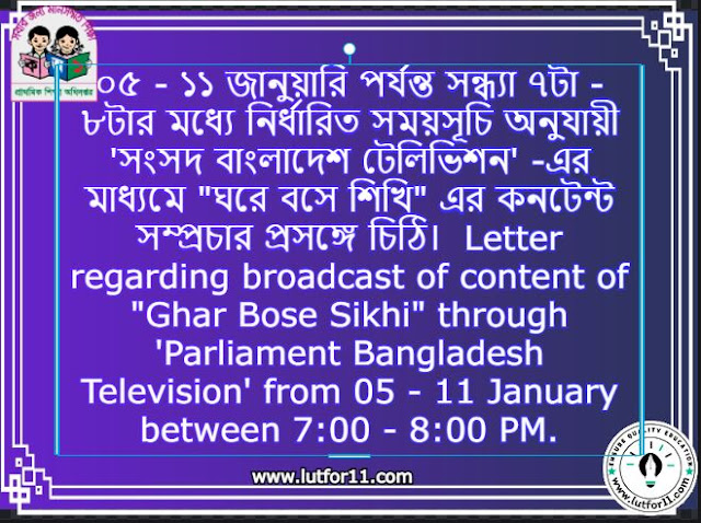 ০৫ - ১১ জানুয়ারি পর্যন্ত সন্ধ্যা ৭টা - ৮টার মধ্যে নির্ধারিত সময়সূচি অনুযায়ী 'সংসদ বাংলাদেশ টেলিভিশন' -এর মাধ্যমে "ঘরে বসে শিখি" এর কনটেন্ট সম্প্রচার প্রসঙ্গে চিঠি। Letter regarding broadcast of content of "Ghar Bose Sikhi" through 'Parliament Bangladesh Television' from 05 - 11 January between 7:00 - 8:00 PM.